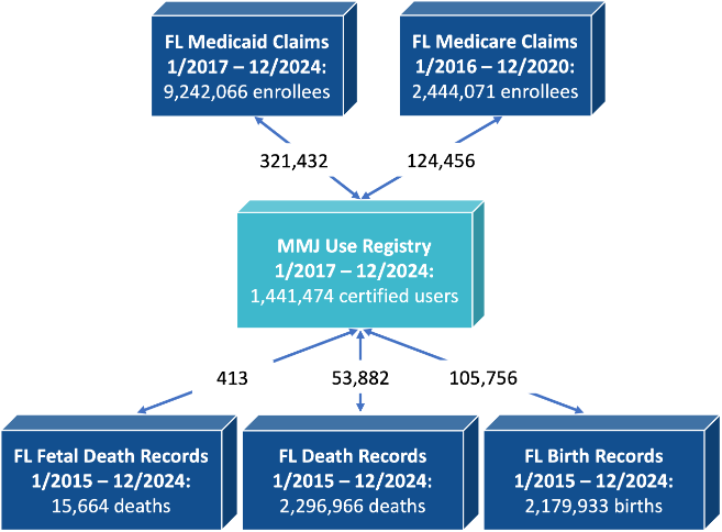 The MEMORY database, built progressively over several years, is evolving into a rich source of clinical outcomes research data (Figure 1). Early efforts in building this repository have focused on integrating important data sources, including MMJ certification and dispensing records from the Florida Department of Health’s (DoH) Office of Medical Marijuana Use (OMMU), Florida State Medicaid claims data, and vital statistics records.