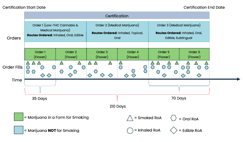 MEMORY contains information derived from the MMJ prescribing process and from dispensary transactions. Certifications permit patients to legally possess MMJ in the state of Florida and may last up to 210 days. Once a patient is certified, physicians may place orders, analogous to prescriptions, for MMJ, which may last up to 35 or 70 days, depending on the route of administration. Orders may be placed for one or more types of MMJ across as little as one or as many as six unique routes of administration. Figure 6 shows the hierarchical relationship between certifications, orders, and order fills, and depicts how what is prescribed and ultimately dispensed may vary over the duration of the certification.