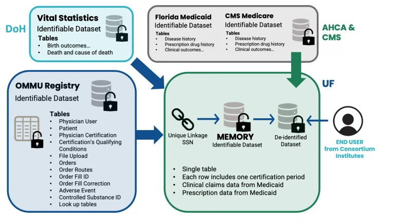 Once OMMU data is received by the MEMORY development group within the Consortium, individual patient records can be linked to medical claims, and vital statistics data based on individual patient identifiers (Figure 1). While the honest broker has access to identifiable information for data linkage purposes, all these variables are encrypted (i.e., 18 HIPPA identifiers will be removed) for researchers. Authorized users for MEMORY will get access to a de-identified dataset of MEMORY, which will be housed at UF.