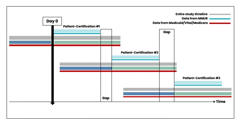 While patient-certifications can occur consecutively if the patient obtains a new certification from their physician (Figure 4), there could also be gaps between the periods of certification (Figure 5). Data from patient-certification record in MEMORY are always anchored on the start date of the patient’s first certification. The look-back and look-forward periods for the ascertainment of baseline variables and clinical outcomes might overlap with periods for another certification record for the same patient.