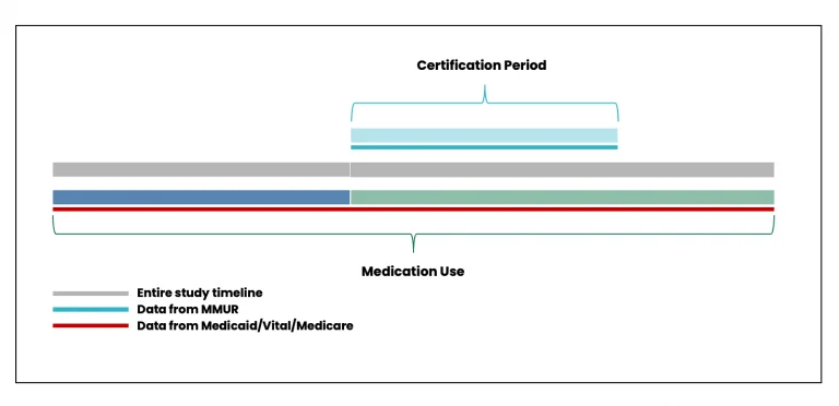 MEMORY will facilitate the design and execution of myriad study types and designs to answer research questions relating to or based on concurrent prescription medication (from linked prescription claims in AHCA Medicaid and CMS Medicare data) and MMJ utilization (from linked MMUR data). Figure 7 shows the timeline for determining concurrent prescription medication and MMJ utilization.