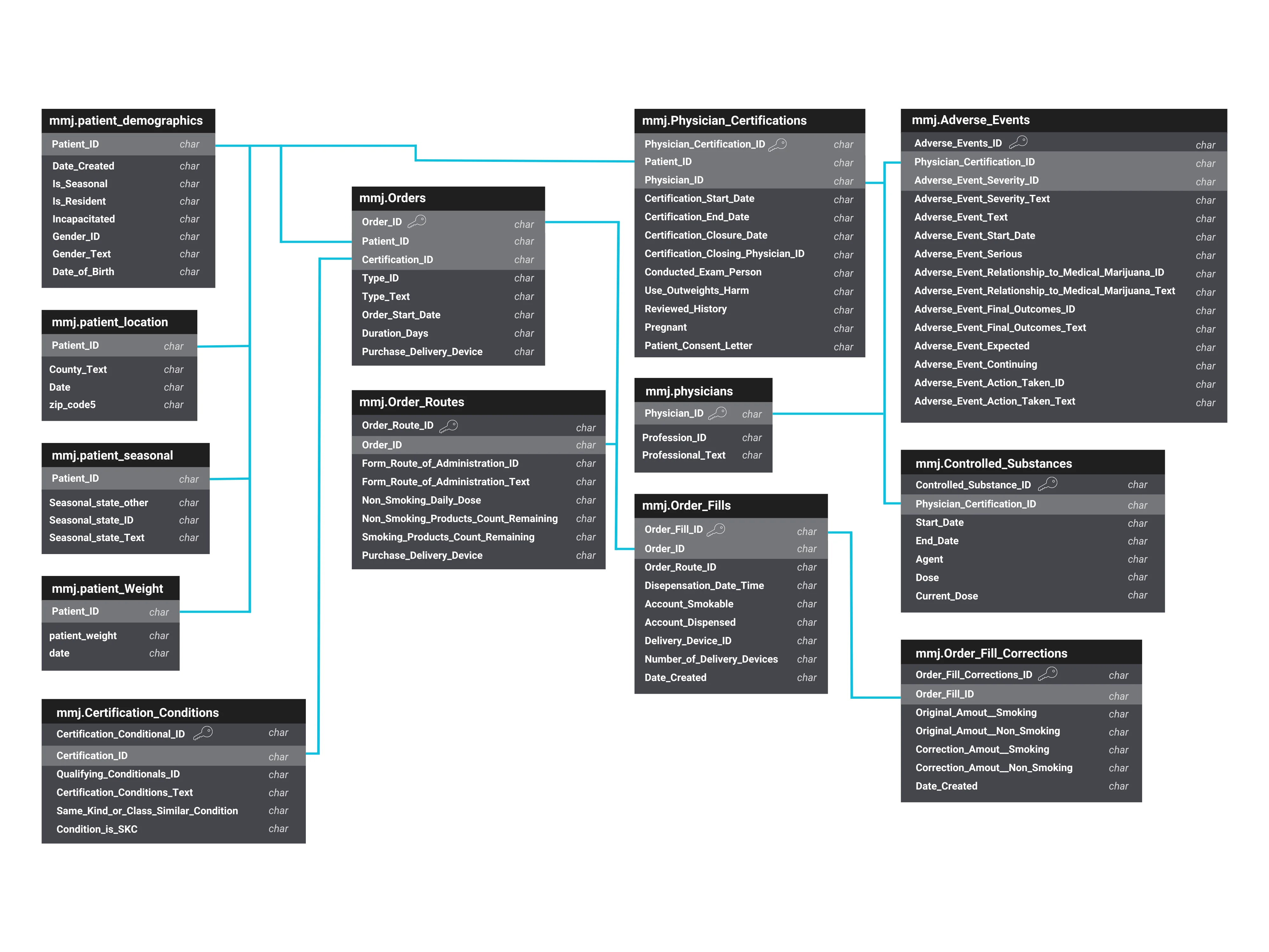 The MEMORY data architecture (Figure 2) represents a comprehensive network of linked tables available in MMUR data, including patients’ demographic details, qualifying medical conditions, medication orders, physicians’ certifications, controlled substance records, and any reported adverse events. This schematic is designed to efficiently organize complex datasets that facilitate a robust analysis of MMJ utilization and its associated outcomes.