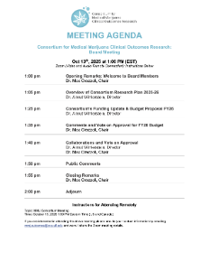 View the most recent Consortium for Medical Marijuana Clinical Outcomes Research Board Meeting agenda.